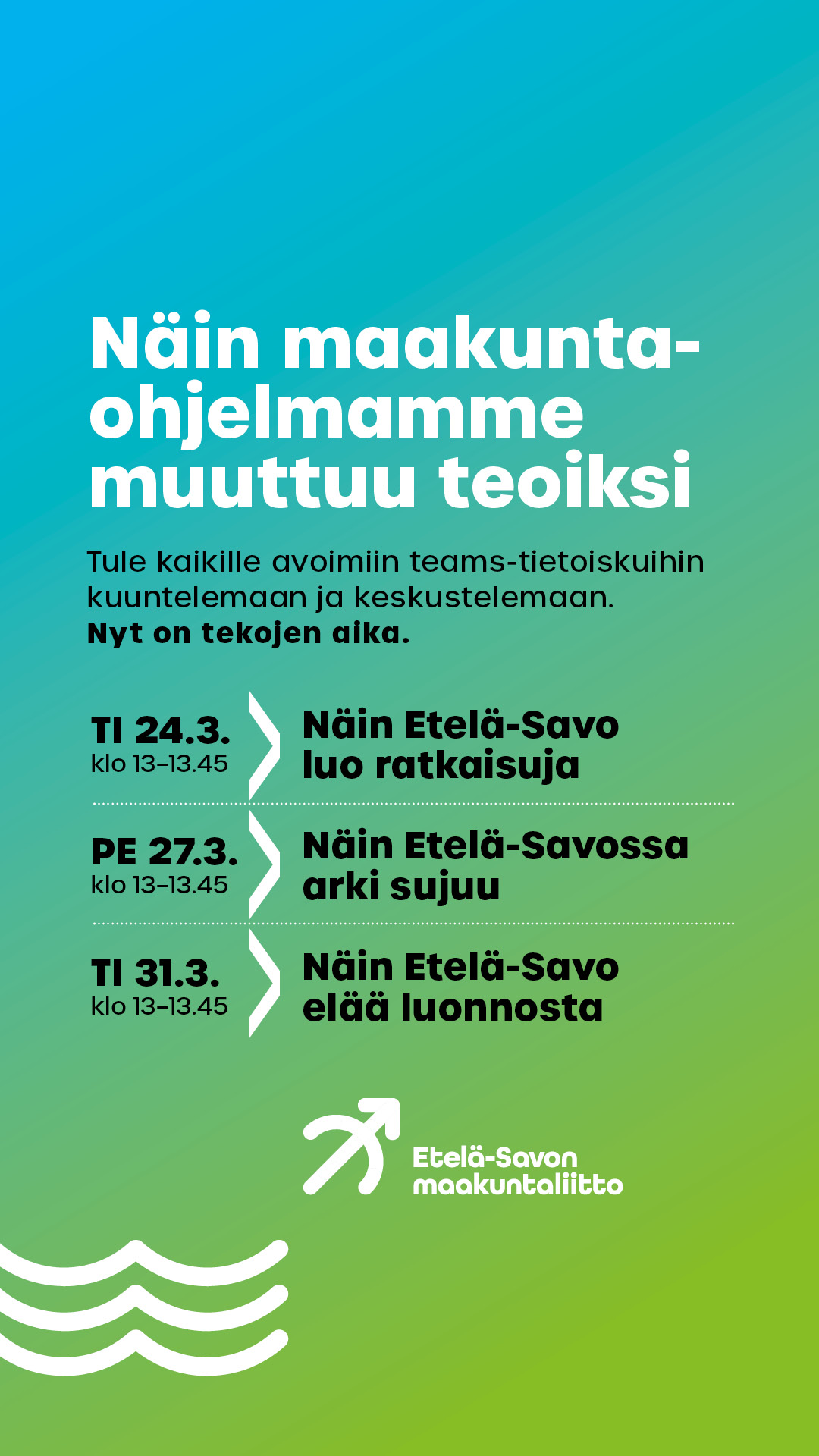 Maakuntaohjelma vuosille 2026-2029 on valmistunut, nyt on tekojen aika! Järjestämme maaliskuun lopulla kolme teemallista TEAMS-tietoiskua, joihin kaikki Etelä-Savon kehittäjät ovat tervetulleita kuulolle sekä ideoimaan kehittämistoimenpiteitä. Tietoiskuja voit seurata livenä ao. linkkien kautta. Niistä tehdään myös videotallenteet tälle sivulle katseltavaksi myöhemmin.