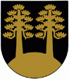 Mustassa kentässä on kaksi kaarityviöstä kasvavaa mäntyä, kaikki kultaa.